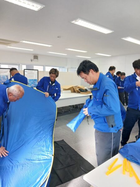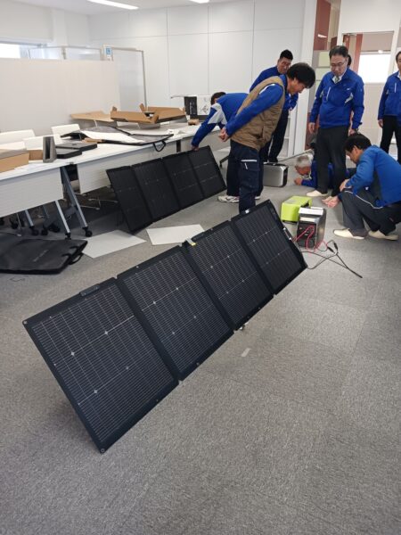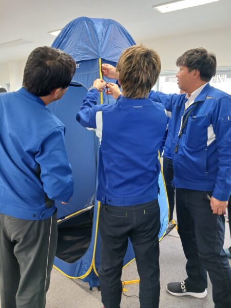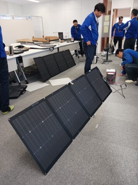 災害時に必要となるポータブル電源やテント式簡易トイレなどの非常用資機材を実際に取り扱い、 ソーラーパネルを用いた電源供給の確認や組立手順を体験しました。